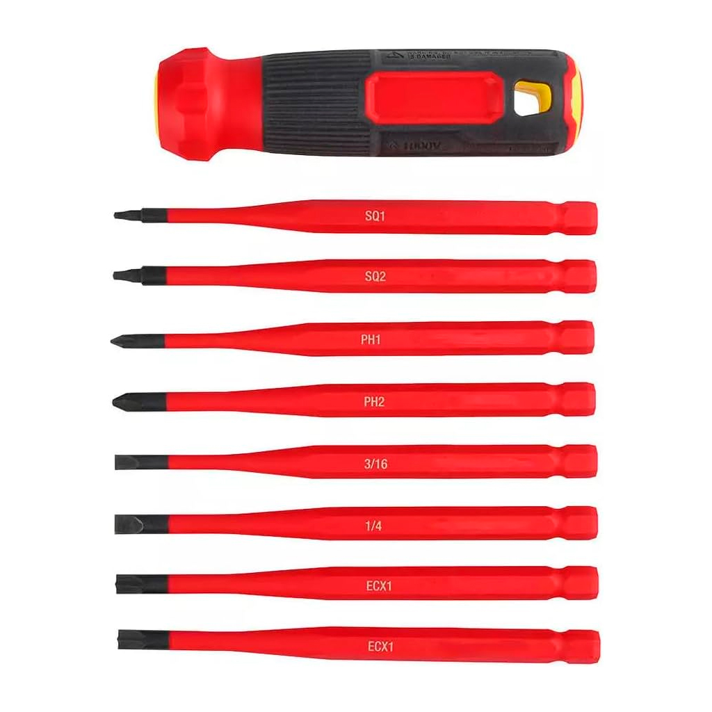 Nuestro destornillador multipunta aislado de punta fina MILWAUKEE® 8 en 1 de 1000 V es más versátil y permite cambiar las puntas fácilmente. Cuenta con una capa de aislamiento al ras en la punta, lo que facilita el acceso a espacios reducidos. Esta capa de aislamiento, con clasificación de 1000 V, es ignífuga y resistente a impactos. Nuestros destornilladores multipunta aislados de punta fina Milwaukee® 8 en 1 de 1000 V cuentan con un cómodo mango cilíndrico e incluyen puntas comunes como Phillips, Cabinet y cuadradas. Estos destornilladores aislados cuentan con clasificación UL, certificación IEC 60900 y ASTM F1505 para herramientas manuales aisladas, y están respaldados por la garantía limitada de por vida de Milwaukee.